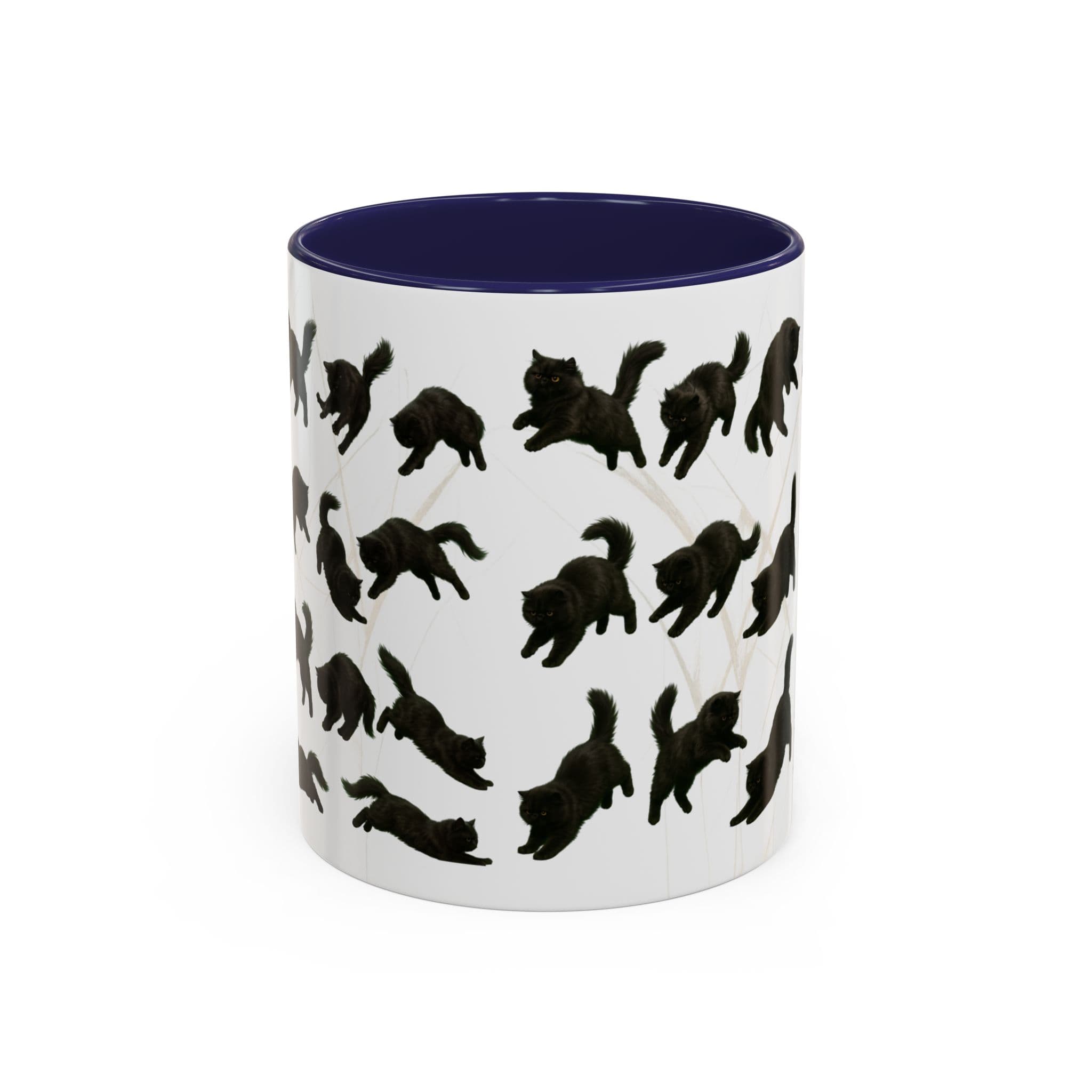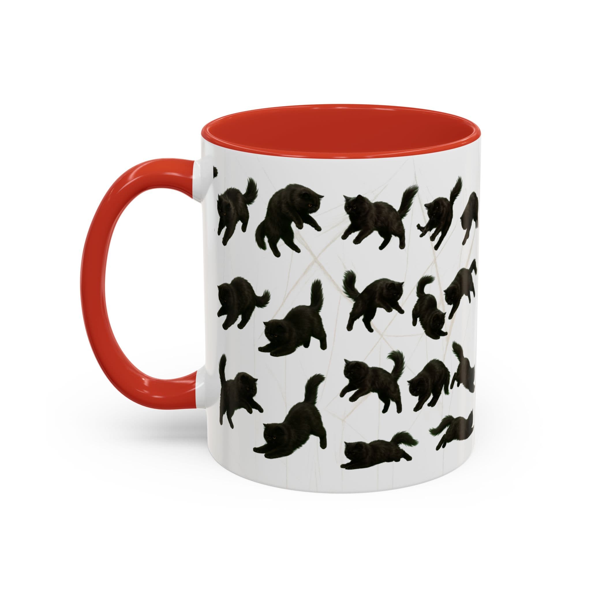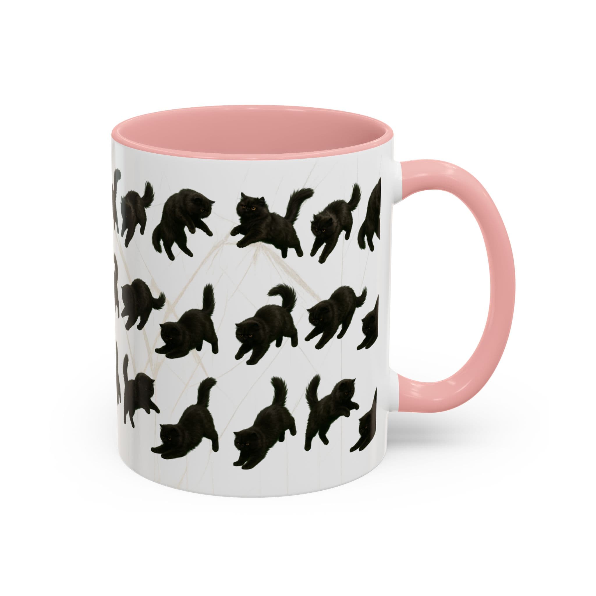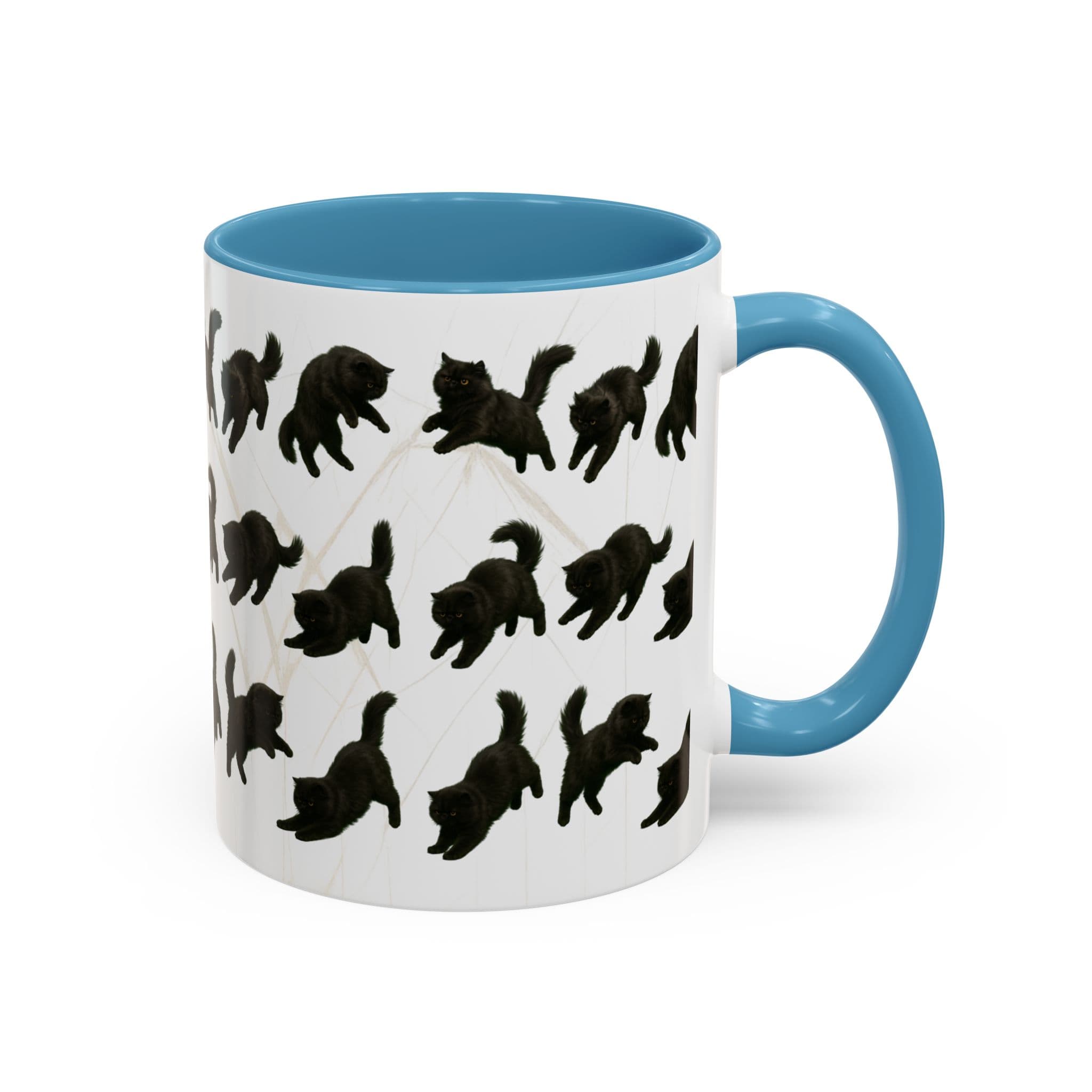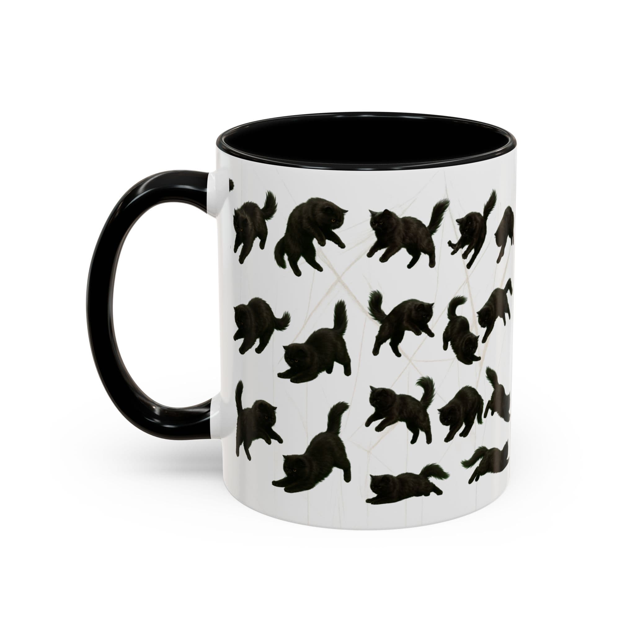 Meet the cat with attitude in every pose. This 11oz ceramic mug features a wraparound print of a mischievous flat-nosed black cat captured mid-stretch, mid-pounce, and mid-nap—perfectly expressing all the moods your coffee understands. The smooth gloss finish and colored interior make it a premium daily cup for anyone who speaks fluent feline.